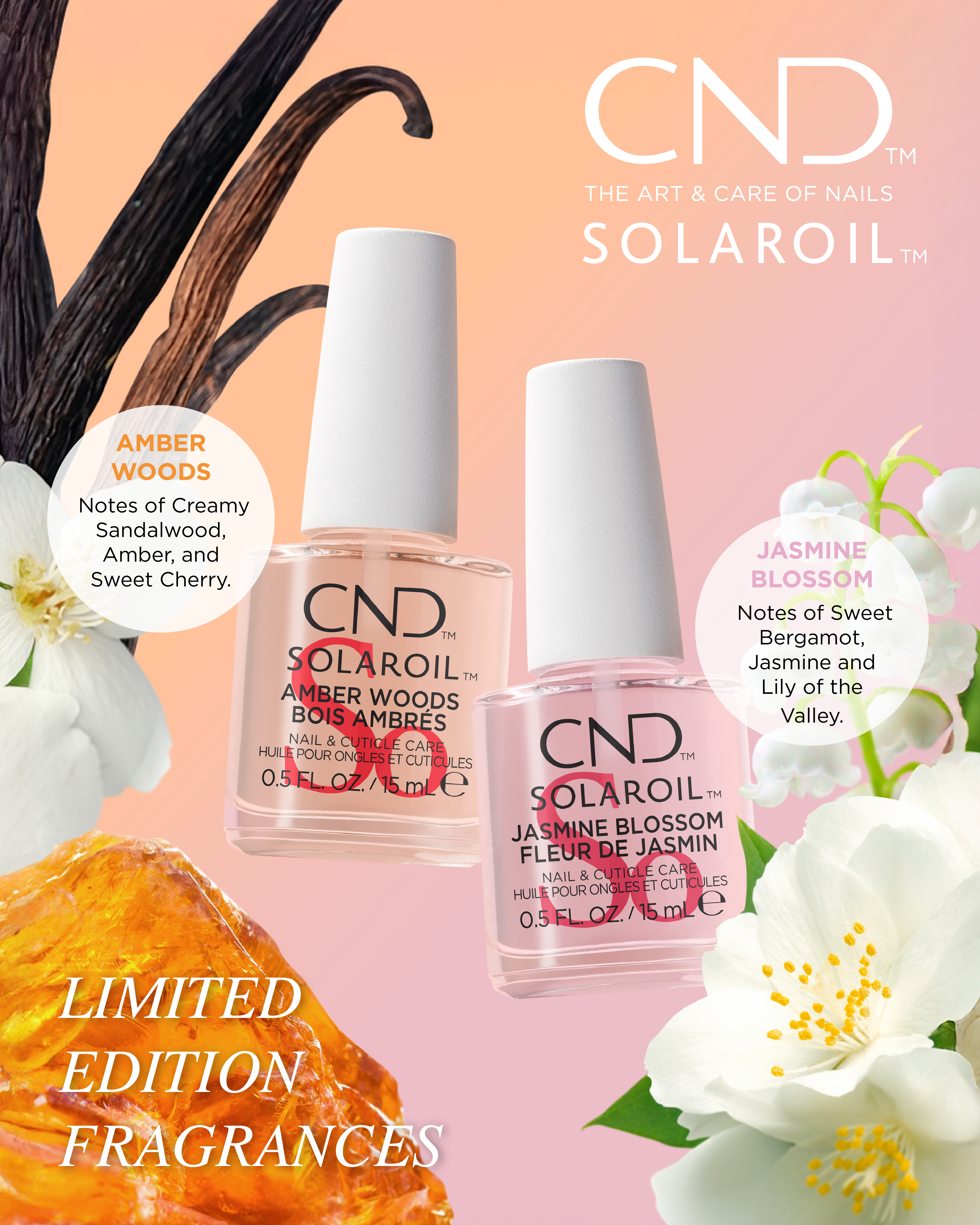 Introducing two new limited-edition fragrances for the award-winning CND™ SOLAROIL™: Amber Woods and Jasmine Blossom. Designed to treat both nails and senses, these new aromatherapeutic blends transform a simple step in nail care into a luxurious moment of self-care.